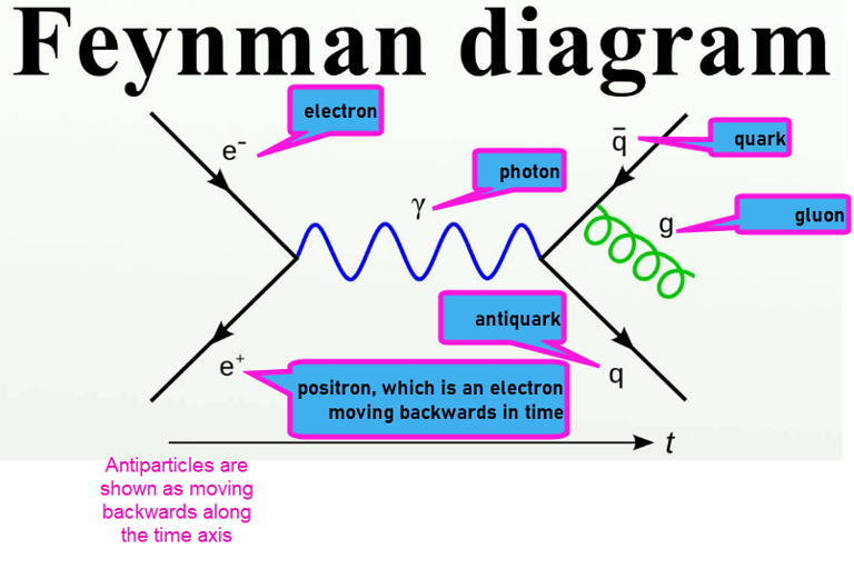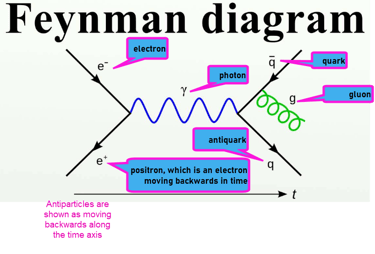 Richard Feynman was a famous Nobel Prize winning physicist, and in 1948 he introduced a diagram to illustrate a difficult idea in physics. These are now called Feynman diagrams. If you Google Feynman diagram, the first one that comes up is this little number here. It's pretty, isn't it? And simple. I got a jewelry version of this Feynman drawing from Etsy. This diagram made it onto jewelry. This particular diagram shows movement through time and space for a particular subatomic occurrence. On the x axis, at the bottom, is space. On the y axis is time. An electron plus a positron annihilates, producing a photon that becomes a quark-antiquark pair after which the antiquark radiates a gluon.